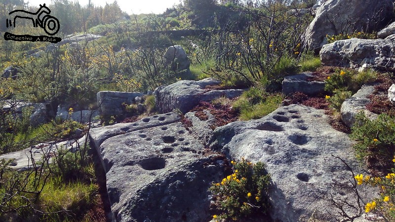 Do rebaixe de forma triangular parte un longo suco sinuoso (D) que descende pola superficie da rocha ata outra pía alongada situada na esquina suroeste da peneda. As dimensións das coviñas e cazoletas son moi diversas, sendo as dúas maiores as localizadas na cima da peneda con dimensións de 21x 11 cm e 14 x 10 cm. e 5 cm. de profundidade (B). Pola contra as máis pequenas localízanse na agrupación circular con coviñas duns 3 cm de diámetro e apenas 1-2 cm. de profundidade (C).