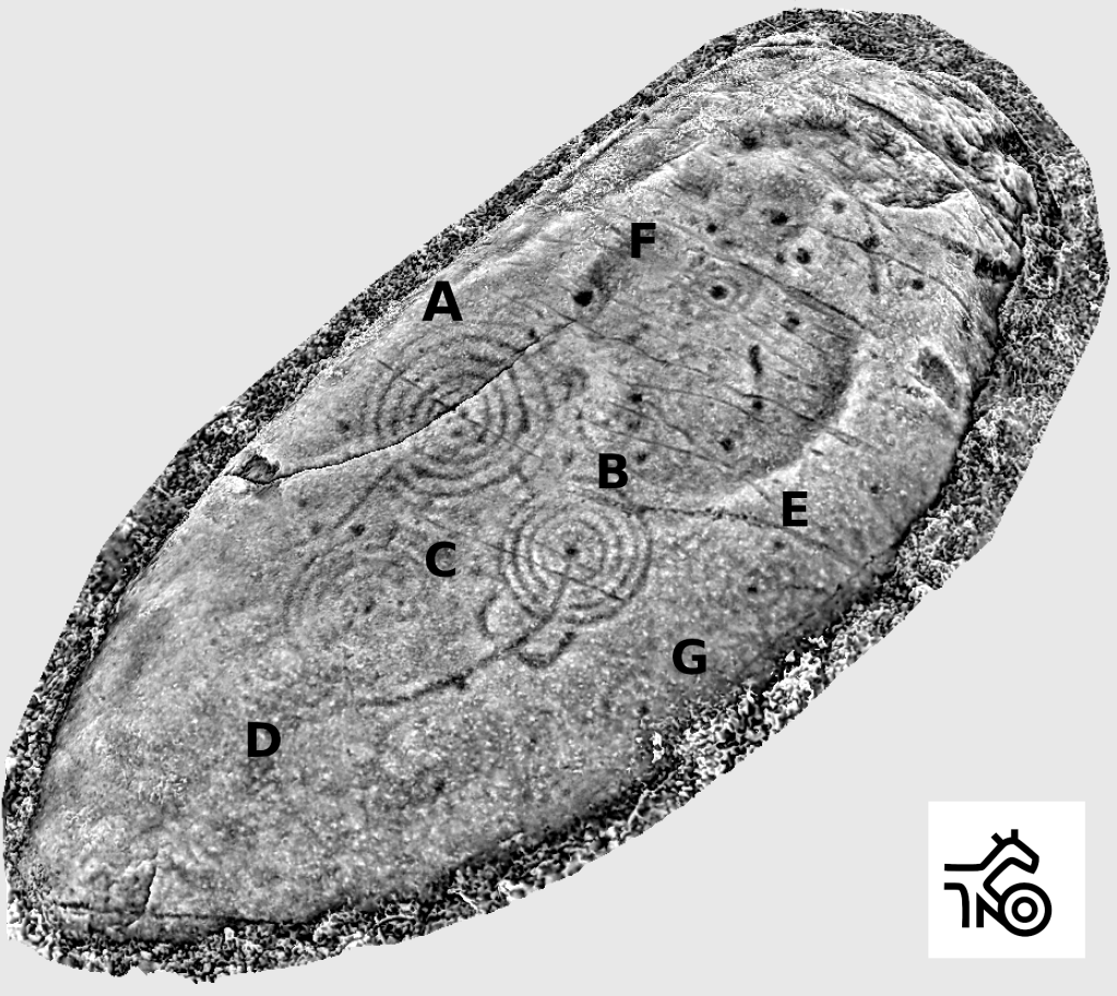 Ocupando a mesma zona lateral podemos identificar outra combinación circular (G), tamén moi erosionada, e formada por cando menos un círculo e unha coviña central. Ten un diámetro de 19 cm. Nesa mesma zona lateral obsérvanse na fotogrametría restos do que poderían ter sido outras dúas combinacións circulares.