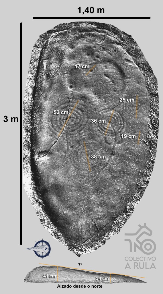 Outra característica de interese é a orientación do soporte, leste-oeste no seu eixo máis longo, aínda que descoñecemos se a elección do soporte para gravar procuraba esta característica ou só foi produto do azar.
