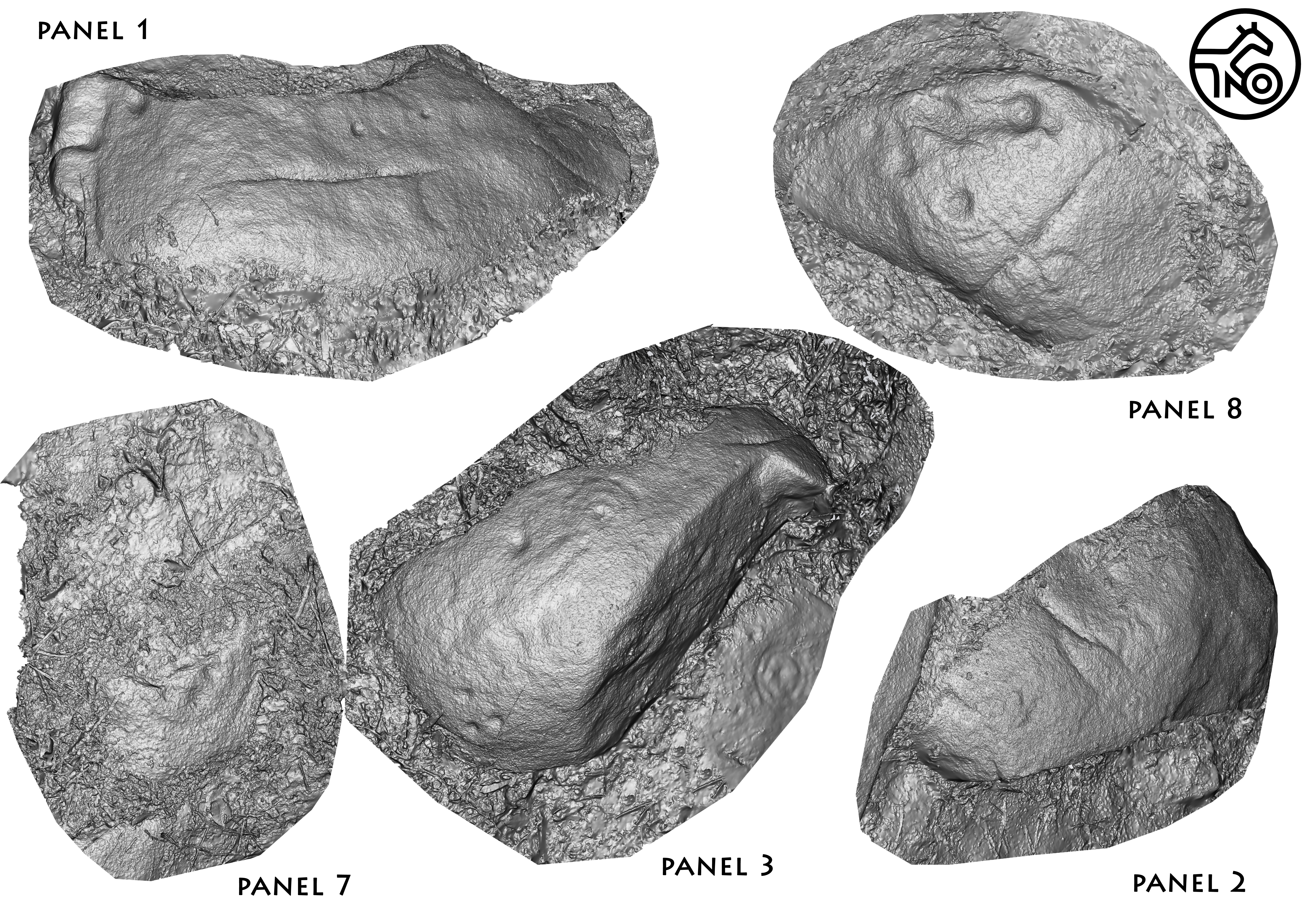 | 8 | 100 x 70 cm | 4 Cazoletas de bo porte (dúas delas unidas), 1 combinación de 2 círculos con adaptación morfolóxica á forma da rocha, con cazoleta central e suco de saída que a une con un anel de forma alongada no extremo inferior | BO |